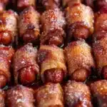 Brown Sugar Bacon Little Smokies are delicious mini sausages wrapped in bacon and coated in sweet brown sugar, baked to crispy perfection.