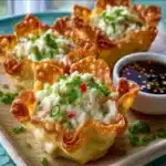 Crispy wonton cups filled with a creamy mixture of cream cheese, imitation crab, and green onions, perfect for sharing at gatherings.