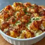Creamy Chicken Alfredo Tater Tot Bake is a comforting casserole that combines shredded chicken, creamy Alfredo sauce, and crispy tater tots topped with melted cheese.