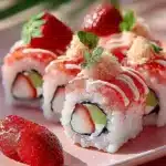 A delightful twist on classic strawberry shortcake, this dessert features sponge cake, cream cheese, and fresh strawberries, rolled into a sushi-inspired treat.