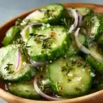 I remember making a cucumber salad with my grandmother in her sunlit kitchen. She would slice fresh cucumbers, their vibrant green skin glistening in the light, while I stood beside her, eagerly waiting to taste the first bite. The cool, crispness of cucumbers, paired with tangy vinegar and a sprinkle of herbs, was always a favorite. You’ll love how simple yet satisfying it is, offering the perfect blend of crunch, zing, and a hint of nostalgia in every bite.