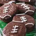 Using white icing to pipe football shapes directly onto chocolate-frosted brownies creates a festive visual that’s perfect for game day.