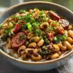 A hearty Southern dish combining black-eyed peas with smoky sausage and crispy bacon, perfect for gatherings and embodying warmth and tradition.